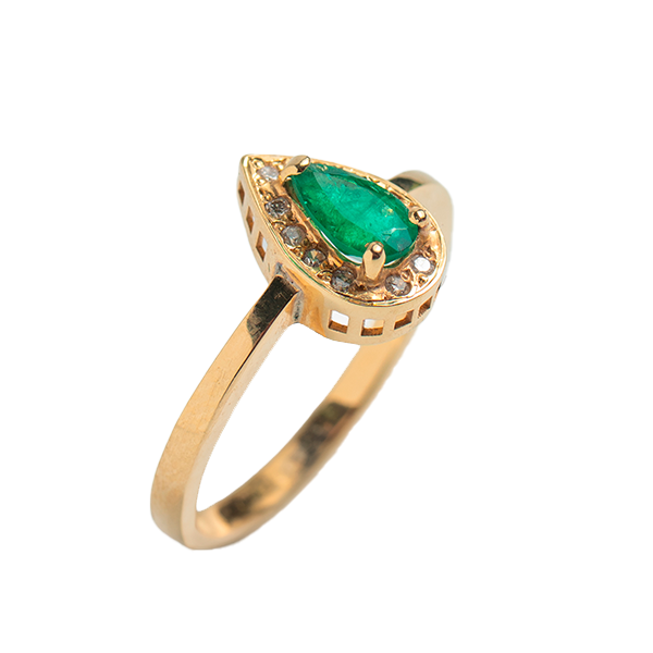 Anel em gota com pedra central Esmeralda e 11 Diamantes - em ouro amarelo 18K. As esmeraldas são uma das mais belas pedras preciosas. Elas possuem uma história rica, com significado profundo e versatilidade.